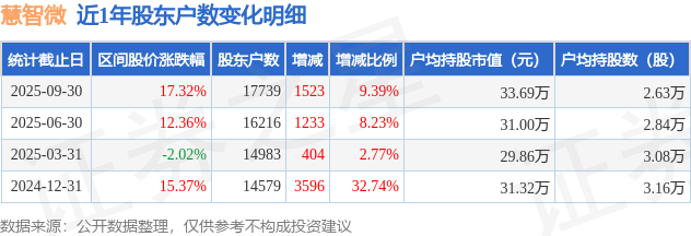从股价来看,2025年6月30日至2025年9月30日,慧智微区间涨幅为17.32%,在此期间股东户数增加1523.0户,增幅为9.39%。