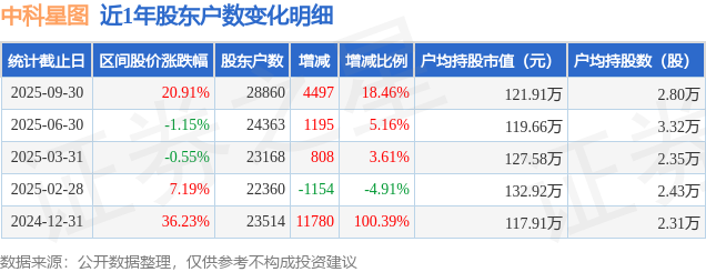 从股价来看,2025年6月30日至2025年9月30日,中科星图区间涨幅为20.91%,在此期间股东户数增加4497.0户,增幅为18.46%。