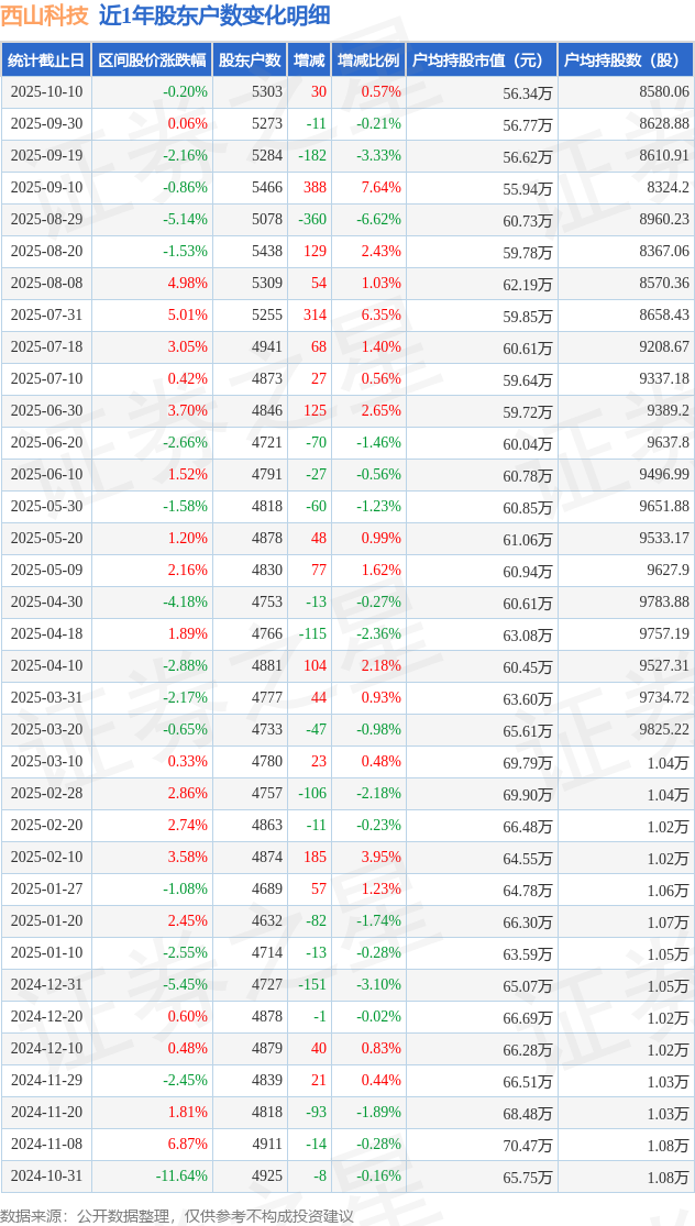 从股价来看,2025年9月30日至2025年10月10日,西山科技区间跌幅为0.2%,在此期间股东户数增加30.0户,增幅为0.57%。