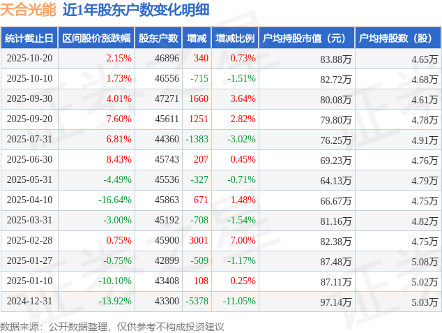 从股价来看,2025年10月10日至2025年10月20日,天合光能区间涨幅为2.15%,在此期间股东户数增加340.0户,增幅为0.73%。