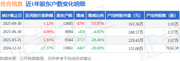 从股价来看,2025年6月30日至2025年9月30日,合合信息区间涨幅为1.12%,在此期间股东户数增加4791.0户,增幅为53.87%。
