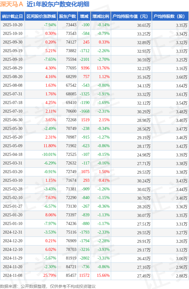 从股价来看,2025年10月10日至2025年10月20日,深天马A区间跌幅为7.94%,在此期间股东户数减少100.0户,减幅为0.14%。