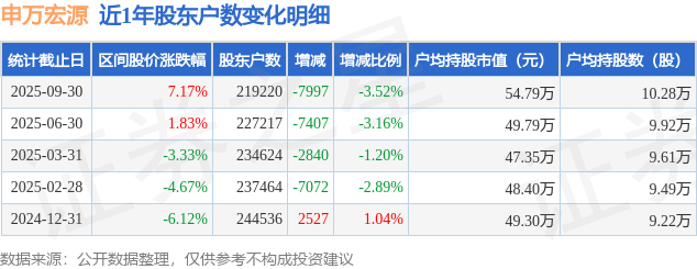 从股价来看,2025年6月30日至2025年9月30日,申万宏源区间涨幅为7.17%,在此期间股东户数减少7997.0户,减幅为3.52%。