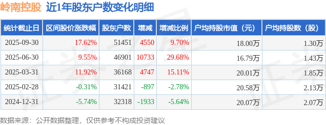 证券之星消息,近日岭南控股披露,截至2025年9月30日公司股东户数为5.15万户,较6月30日增加4550.0户,增幅为9.7%。户均持股数量由上期的1.43万股减少至1.3万股,户均持股市值为18.0万元。