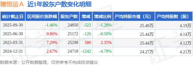 证券之星消息,近日穗恒运A披露,截至2025年9月30日公司股东户数为2.48万户,较6月30日减少322.0户,减幅为1.28%。户均持股数量由上期的4.14万股增加至4.19万股,户均持股市值为25.4万元。