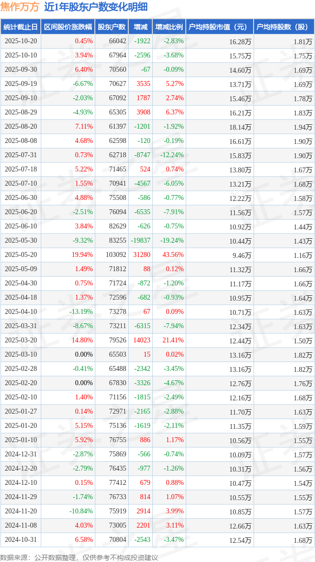 从股价来看,2025年10月10日至2025年10月20日,焦作万方区间涨幅为0.45%,在此期间股东户数减少1922.0户,减幅为2.83%。