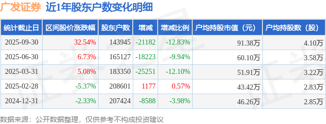 从股价来看,2025年6月30日至2025年9月30日,广发证券区间涨幅为32.54%,在此期间股东户数减少2.12万户,减幅为12.83%。