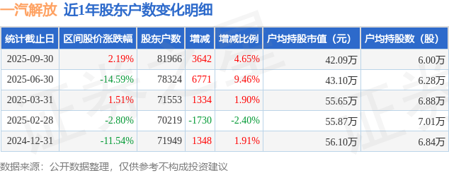 从股价来看,2025年6月30日至2025年9月30日,一汽解放区间涨幅为2.19%,在此期间股东户数增加3642.0户,增幅为4.65%。