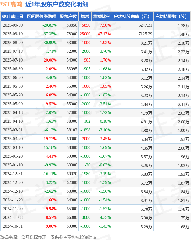 从股价来看,2025年9月19日至2025年9月30日,*ST高鸿区间跌幅为20.83%,在此期间股东户数增加5850.0户,增幅为7.5%。