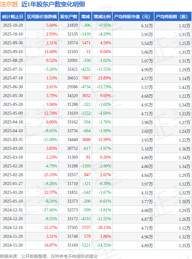 从股价来看,2025年10月10日至2025年10月20日,法尔胜区间涨幅为5.04%,在此期间股东户数减少306.0户,减幅为0.95%。