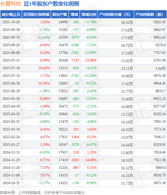 从股价来看,2025年9月30日至2025年10月20日,长青科技区间涨幅为2.05%,在此期间股东户数减少266.0户,减幅为1.74%。