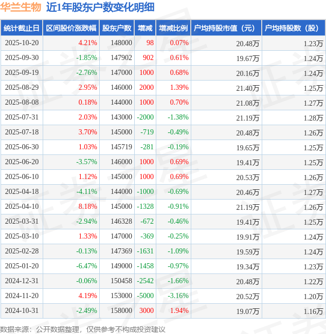 从股价来看,2025年9月30日至2025年10月20日,华兰生物区间涨幅为4.21%,在此期间股东户数增加98.0户,增幅为0.07%。