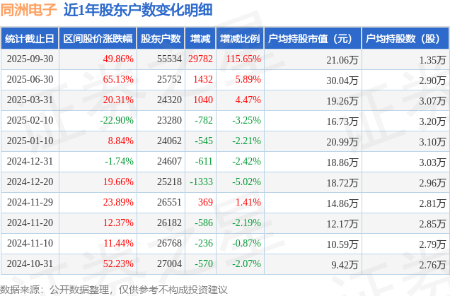 证券之星消息,近日同洲电子披露,截至2025年9月30日公司股东户数为5.55万户,较6月30日增加2.98万户,增幅为115.65%。户均持股数量由上期的2.9万股减少至1.35万股,户均持股市值为21.06万元。