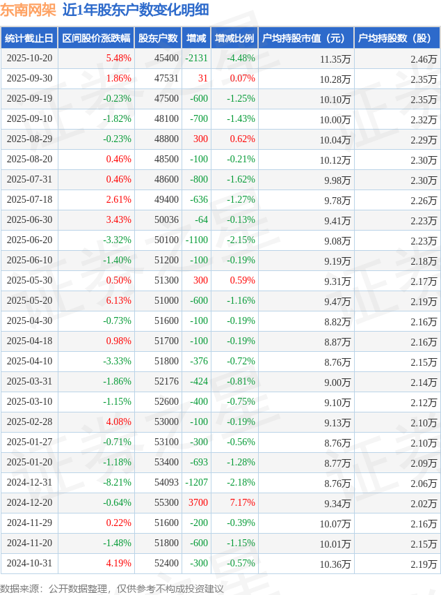 证券之星消息,近日东南网架披露,截至2025年10月20日公司股东户数为4.54万户,较9月30日减少2131.0户,减幅为4.48%。户均持股数量由上期的2.35万股增加至2.46万股,户均持股市值为11.35万元。