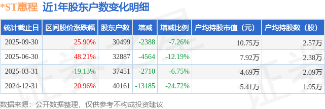 从股价来看,2025年6月30日至2025年9月30日,*ST惠程区间涨幅为25.9%,在此期间股东户数减少2388.0户,减幅为7.26%。