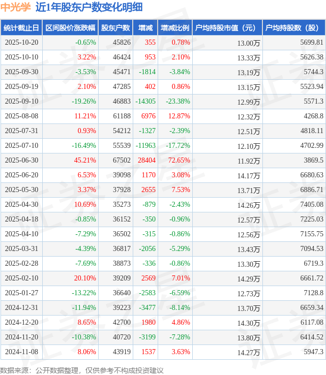 从股价来看,2025年9月30日至2025年10月20日,中光学区间跌幅为0.65%,在此期间股东户数增加355.0户,增幅为0.78%。