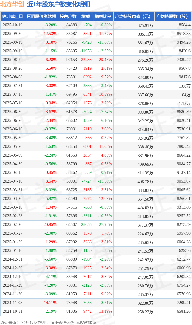 从股价来看,2025年9月30日至2025年10月10日,北方华创区间跌幅为3.2%,在此期间股东户数减少704.0户,减幅为0.83%。