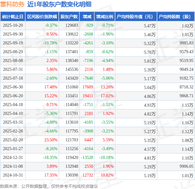 从股价来看,2025年9月30日至2025年10月20日,雷科防务区间跌幅为0.37%,在此期间股东户数减少929.0户,减幅为0.71%。