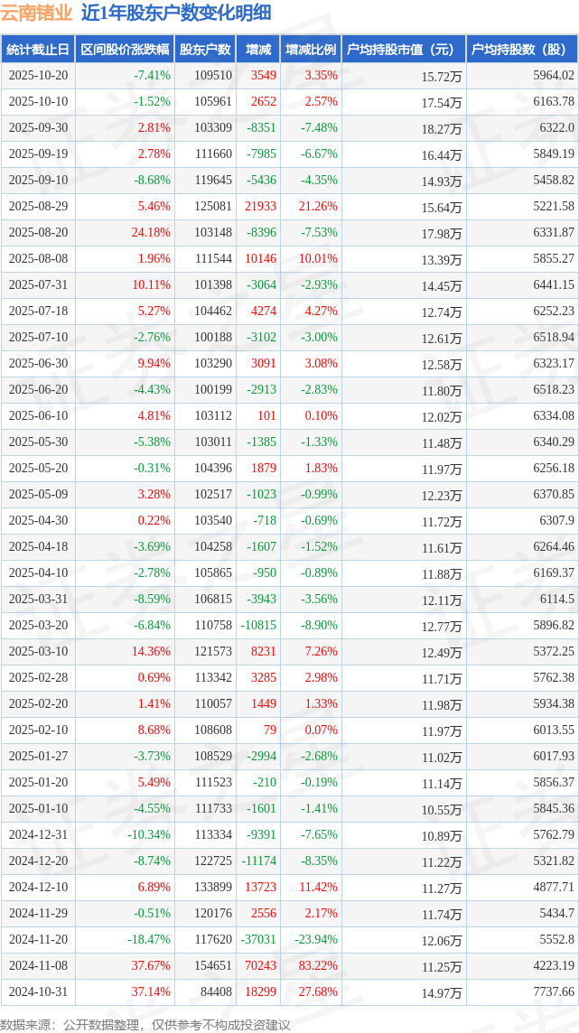 从股价来看,2025年10月10日至2025年10月20日,云南锗业区间跌幅为7.41%,在此期间股东户数增加3549.0户,增幅为3.35%。