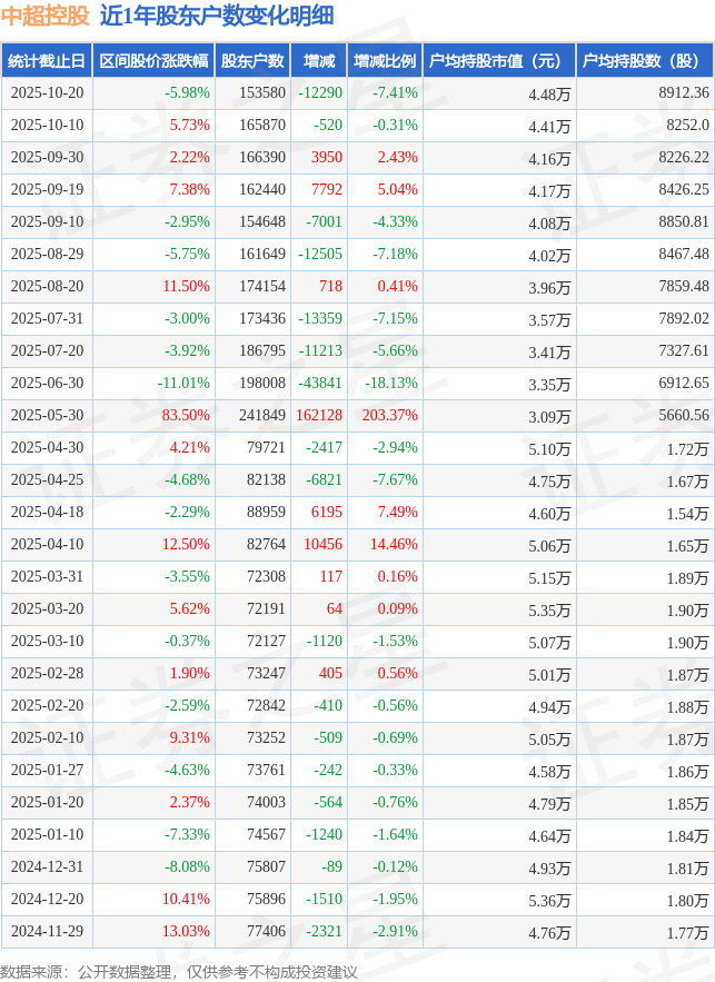 从股价来看,2025年10月10日至2025年10月20日,中超控股区间跌幅为5.98%,在此期间股东户数减少1.23万户,减幅为7.41%。