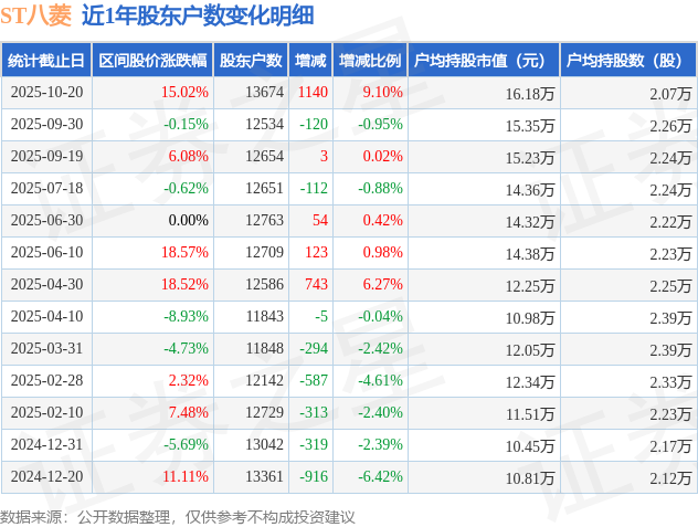 从股价来看,2025年9月30日至2025年10月20日,ST八菱区间涨幅为15.02%,在此期间股东户数增加1140.0户,增幅为9.1%。