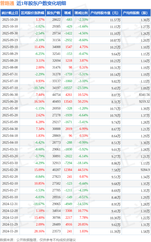 从股价来看,2025年10月10日至2025年10月20日,普路通区间涨幅为1.37%,在此期间股东户数减少683.0户,减幅为2.33%。
