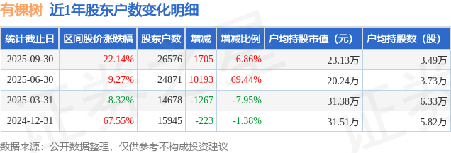 从股价来看,2025年6月30日至2025年9月30日,有棵树区间涨幅为22.14%,在此期间股东户数增加1705.0户,增幅为6.86%。