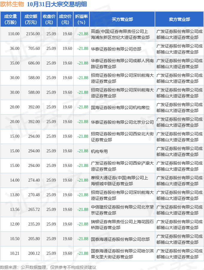 证券之星消息,10月31日欧林生物发生大宗交易,交易数据如下: