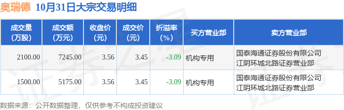 证券之星消息,10月31日奥瑞德发生大宗交易,交易数据如下: