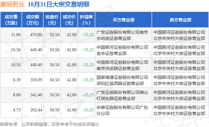 证券之星消息,10月31日康辰药业发生大宗交易,交易数据如下: