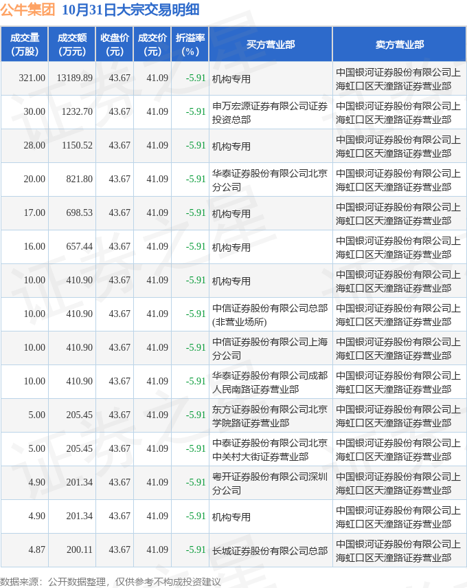 证券之星消息,10月31日公牛集团发生大宗交易,交易数据如下:
