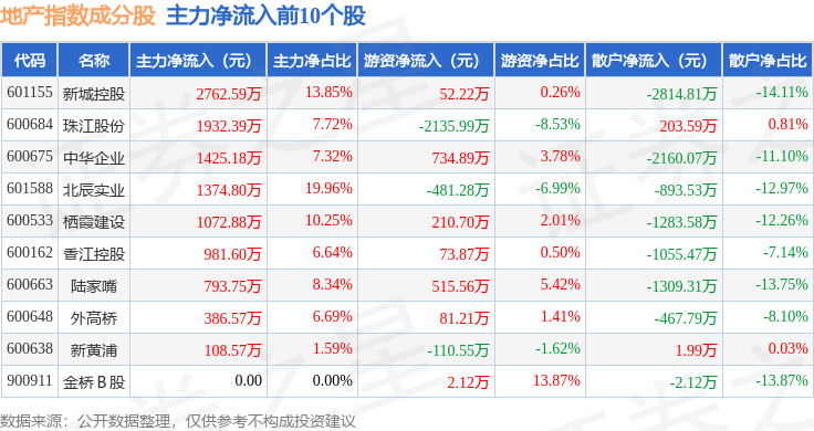资金流向方面,地产指数(000006)成份股当日主力资金净流出合计3.46亿元,游资资金净流入合计2.36亿元,散户资金净流入合计1.1亿元。成份股资金流向详情见下表: