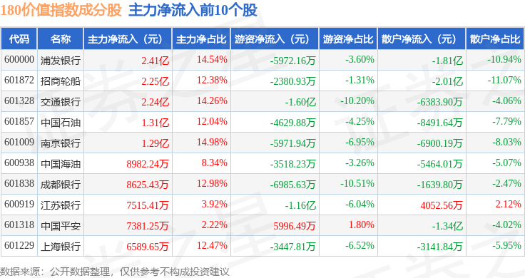 资金流向方面,180价值(000029)指数成份股当日主力资金净流出合计27.71亿元,游资资金净流入合计17.16亿元,散户资金净流入合计10.55亿元。成份股资金流向详情见下表: