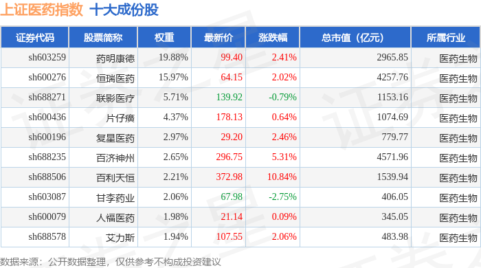 上证医药(000037)指数十大成份股详情如下: