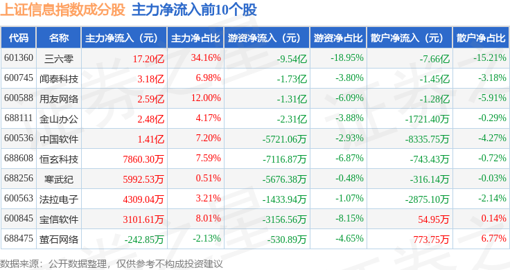 资金流向方面,上证信息(000039)指数成份股当日主力资金净流出合计126.22亿元,游资资金净流入合计46.58亿元,散户资金净流入合计79.64亿元。成份股资金流向详情见下表: