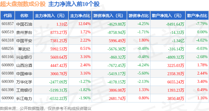资金流向方面,超大盘(000043)指数成份股当日主力资金净流出合计57.13亿元,游资资金净流入合计32.97亿元,散户资金净流入合计24.16亿元。成份股资金流向详情见下表: