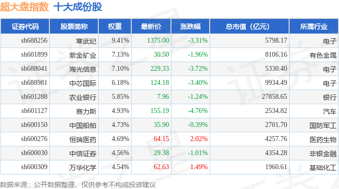 超大盘(000043)指数十大成份股详情如下: