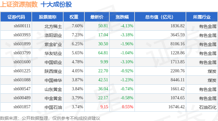 证券之星消息,10月31日,上证资源(000068)指数报收于3836.37点,跌1.77%,成交676.79亿元,换手率0.87%。当日该指数成份股中,上涨的有8家,方大炭素以2.33%的涨幅领涨,下跌的有39家,西部超导以7.4%的跌幅领跌。