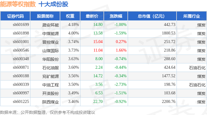 能源等权(000070)指数十大成份股详情如下: