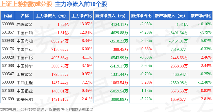 资金流向方面,上证上游(000094)指数成份股当日主力资金净流出合计41.12亿元,游资资金净流入合计9.51亿元,散户资金净流入合计31.61亿元。成份股资金流向详情见下表:
