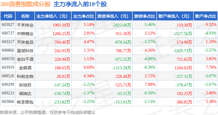 资金流向方面,380消费(000108)指数成份股当日主力资金净流出合计1.68亿元,游资资金净流出合计1184.36万元,散户资金净流入合计1.8亿元。成份股资金流向详情见下表: