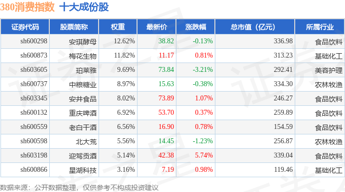 证券之星消息,10月31日,380消费(000108)指数报收于12217.11点,涨0.65%,成交57.82亿元,换手率1.32%。当日该指数成份股中,上涨的有14家,广州酒家以6.65%的涨幅领涨,下跌的有6家,珀莱雅以3.21%的跌幅领跌。