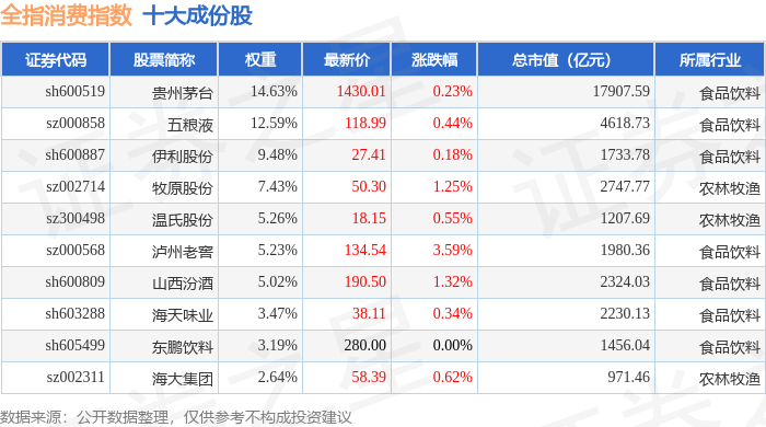 证券之星消息,10月31日,全指消费(000990)指数报收于13429.72点,涨0.82%,成交361.13亿元,换手率0.99%。当日该指数成份股中,上涨的有39家,古井贡酒以6.38%的涨幅领涨,下跌的有10家,珀莱雅以3.21%的跌幅领跌。