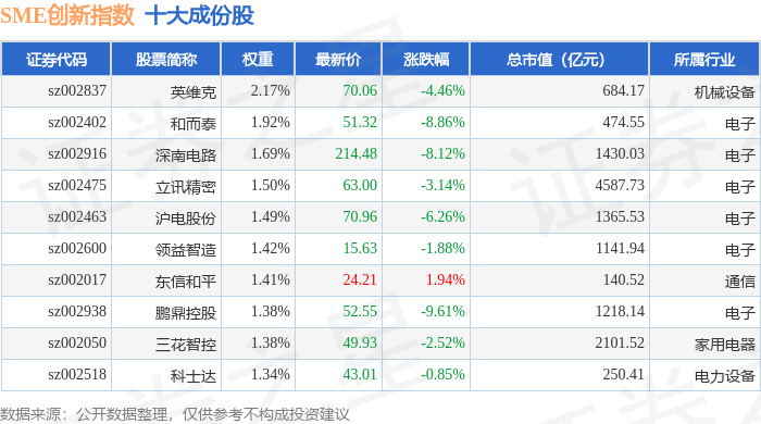 证券之星消息,10月31日,SME创新(399017)指数报收于4857.86点,跌0.75%,成交1388.19亿元,换手率3.06%。当日该指数成份股中,上涨的有49家,海思科以10.0%的涨幅领涨,下跌的有51家,鹏鼎控股以9.61%的跌幅领跌。