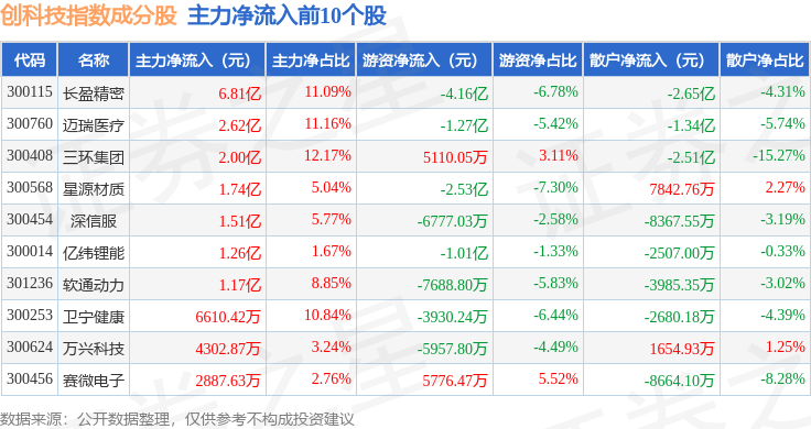 资金流向方面,创科技(399276)指数成份股当日主力资金净流出合计49.59亿元,游资资金净流入合计25.24亿元,散户资金净流入合计24.35亿元。成份股资金流向详情见下表: