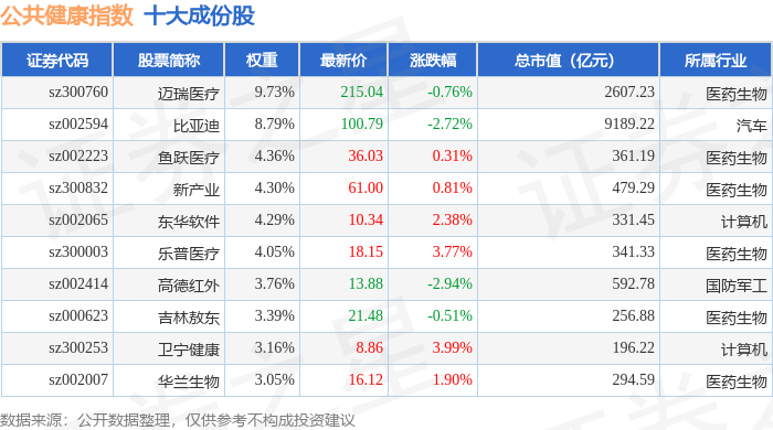 公共健康(399277)指数十大成份股详情如下: