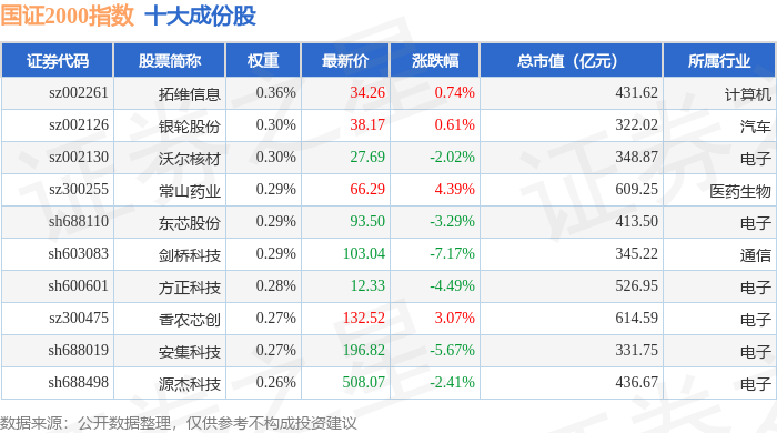 国证2000(399303)指数十大成份股详情如下: