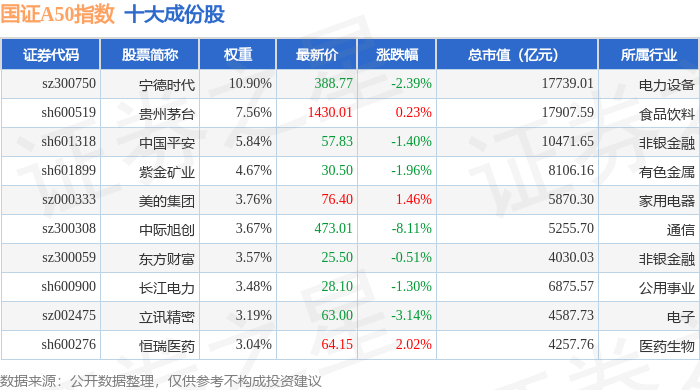 资金流向方面,国证A50(399310)指数成份股当日主力资金净流出合计142.38亿元,游资资金净流入合计59.83亿元,散户资金净流入合计82.55亿元。成份股资金流向详情见下表: