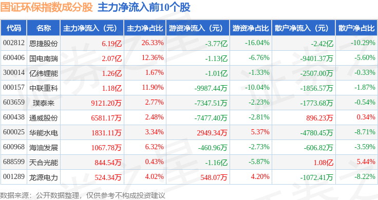 资金流向方面,国证环保(399358)指数成份股当日主力资金净流出合计74.79亿元,游资资金净流入合计7.83亿元,散户资金净流入合计66.96亿元。成份股资金流向详情见下表: