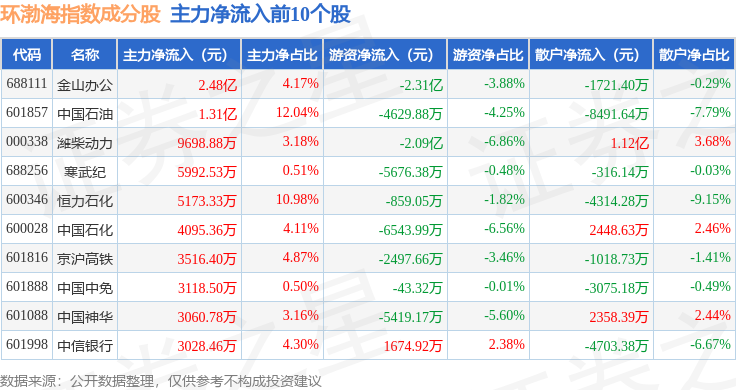 资金流向方面,环渤海(399357)指数成份股当日主力资金净流出合计54.4亿元,游资资金净流入合计45.61亿元,散户资金净流入合计8.79亿元。成份股资金流向详情见下表:
